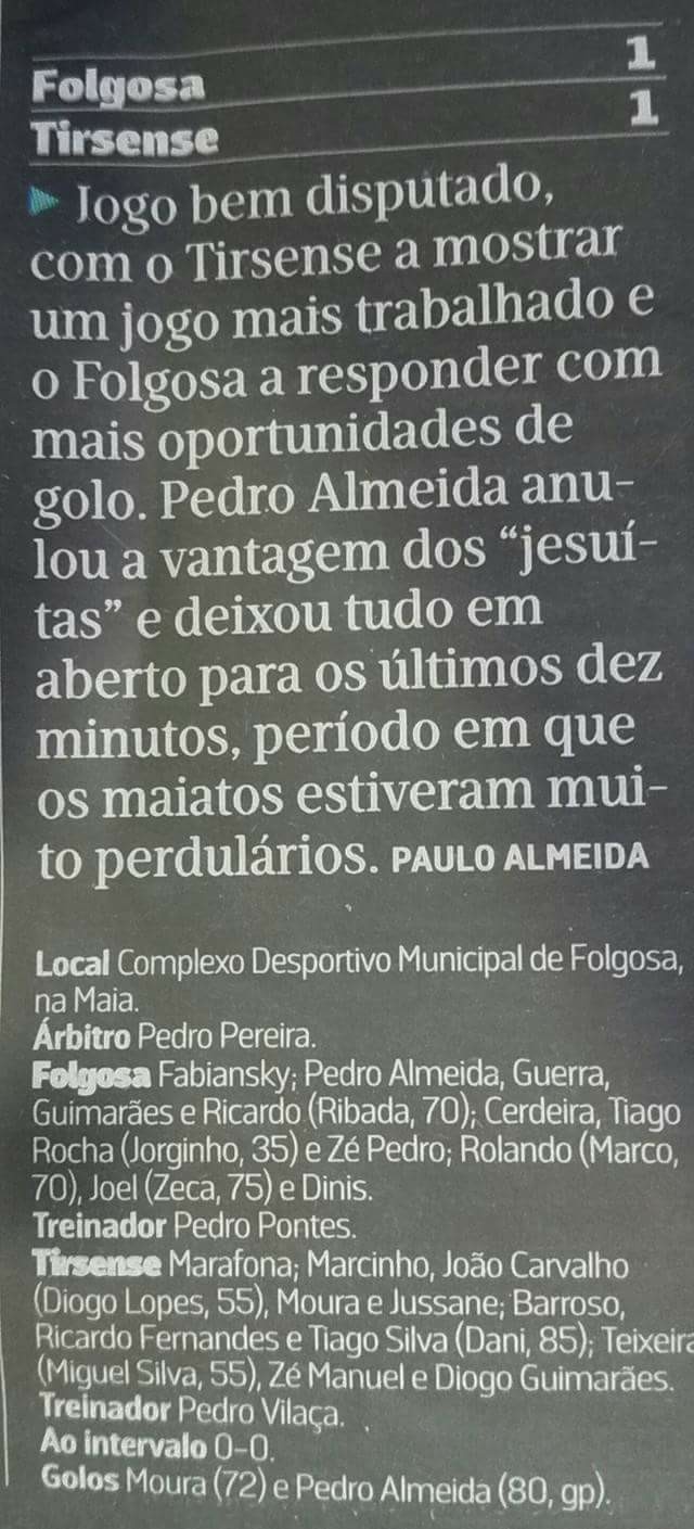 Séniores – Folgosa da Maia FC 1 x FC Tirsense 1 “A primeira regra para ganhar, é aprender a não perder”. Compromisso, qualidade, motivação e atrevimento. + 1 ponto! FORÇA FOLGOSA DA MAIA FC!! Na Elite, com muita Honra! “Pedro Pontes” Partilhar Clique para partilhar no Facebook (Abre numa nova janela) Facebook Gosto Carregando... Relacionado