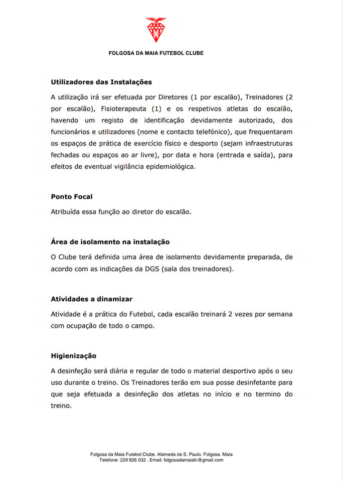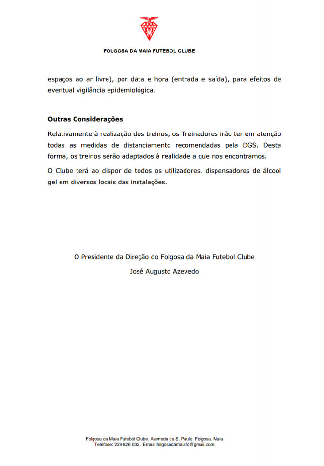 O Folgosa da Maia Futebol Clube informa que irá retomar a sua atividade desportiva com a autorização da Camara Municipal da Maia e cumprindo todas as diretrizes impostas pela Direção Geral Saúde.