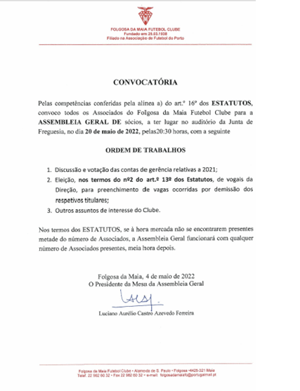 O Folgosa Maia F.C. vai realizar uma Assembleia Geral, no dia 20 de maio de 2022, pelas 20h30 no auditório da Junta Freguesia de Folgosa.