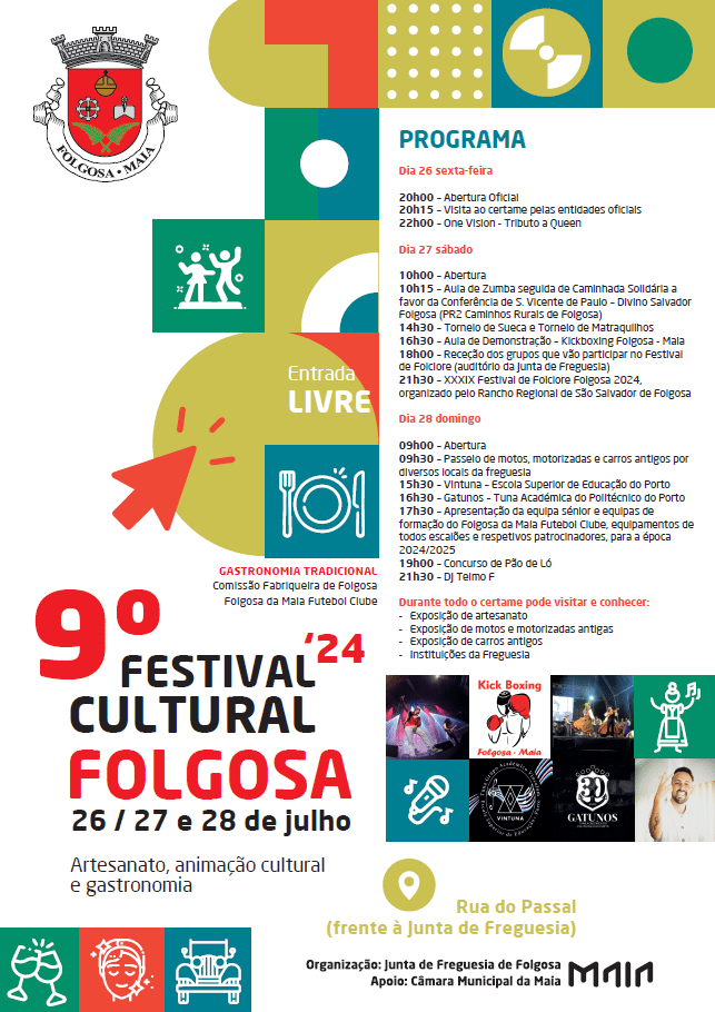 O ”9ºFestival Cultural de Folgosa” é uma iniciativa da Junta de Freguesia de Folgosa da Maia e decorre na Rua do Passal.