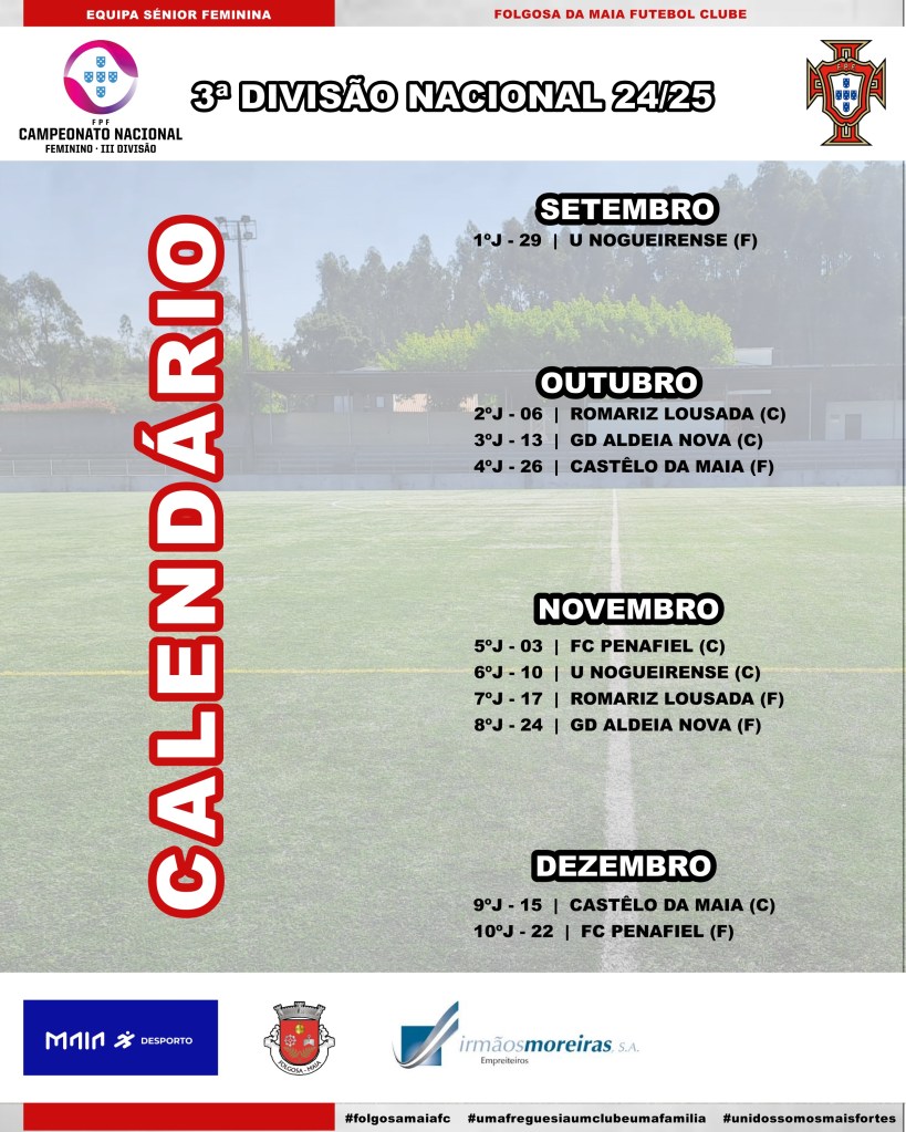 A nossa equipa sénior feminina, liderada por Guilherme Silva, defrontará na 1ªJornada da 3ªDivisão Nacional, o U Nogueirense FC, fora, os seguintes 5 jogos são os seguintes.