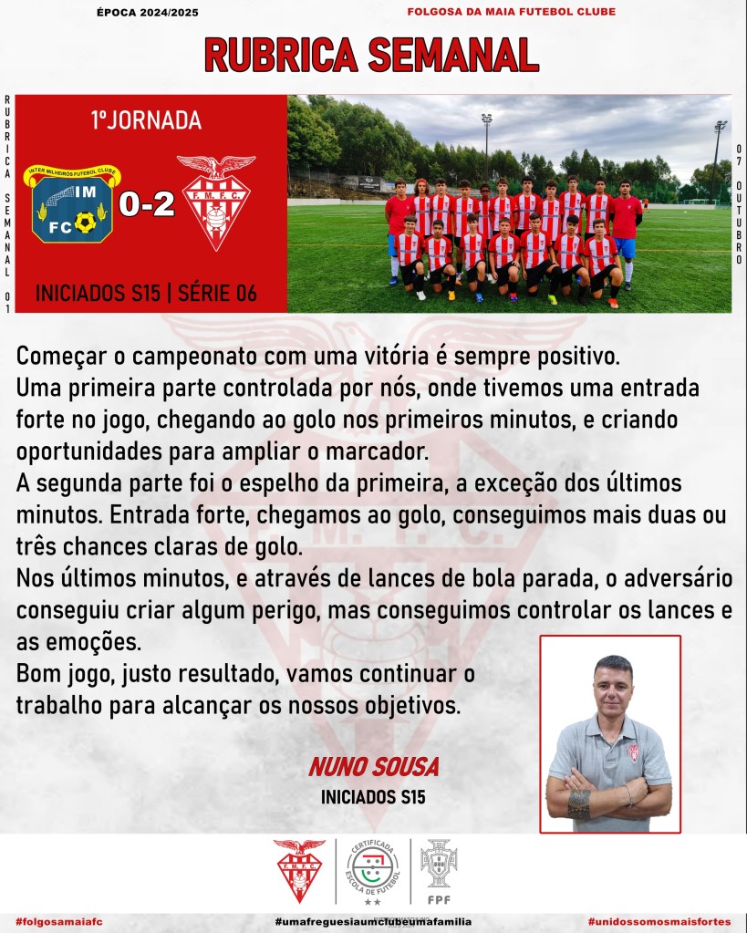 O Folgosa da Maia F.C. irá iniciar no dia de hoje a “Rubrica Semanal”. Esta pequena rubrica e iniciativa pretende dar foco a um jogo por fim de semana competitivo, de um dos nossos escalões de formação do nosso clube.