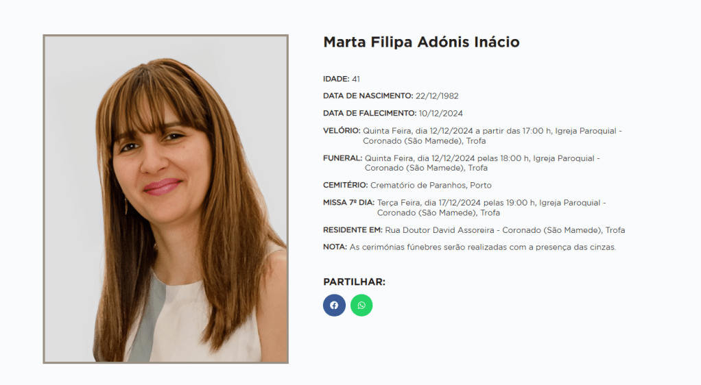 É com profundo pesar que cumprimos o doloroso dever de participar a todos os associados e amigos do Folgosa da Maia Futebol Clube, o falecimento de Marta Filipa Adónis Inácio, Esposa do nosso Diretor e elemento da direção, Eurico Casteleiro.