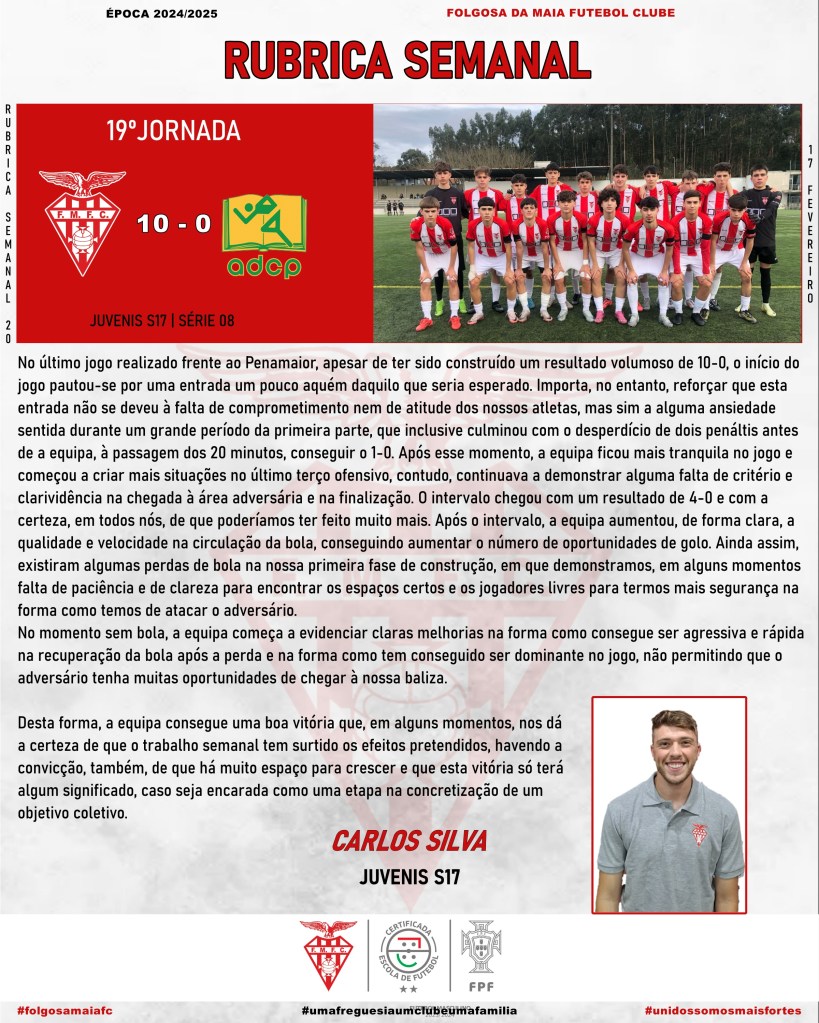 “Rubrica Semanal” – esta pequena rubrica e iniciativa pretende dar foco a um jogo por fim de semana competitivo, de um dos nossos escalões de formação do nosso clube.