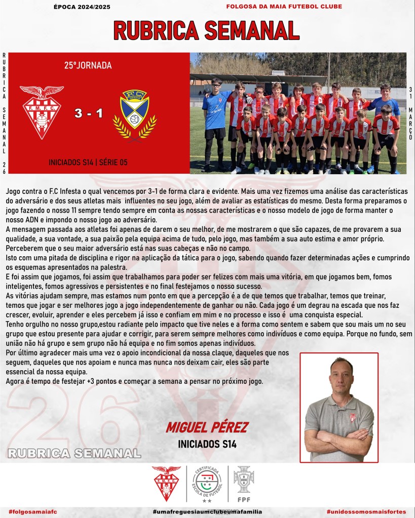 “Rubrica Semanal” – esta pequena rubrica e iniciativa pretende dar foco a um jogo por fim de semana competitivo, de um dos nossos escalões de formação do nosso clube.