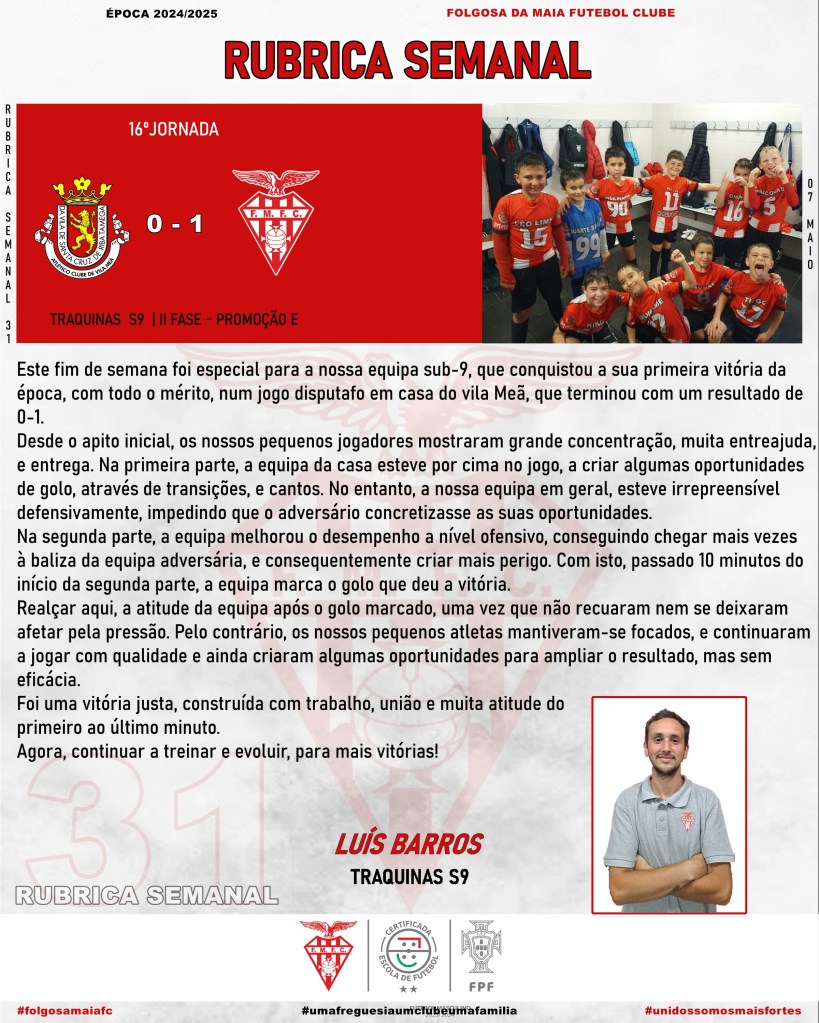 “Rubrica Semanal” – esta pequena rubrica e iniciativa pretende dar foco a um jogo por fim de semana competitivo, de um dos nossos escalões de formação do nosso clube.