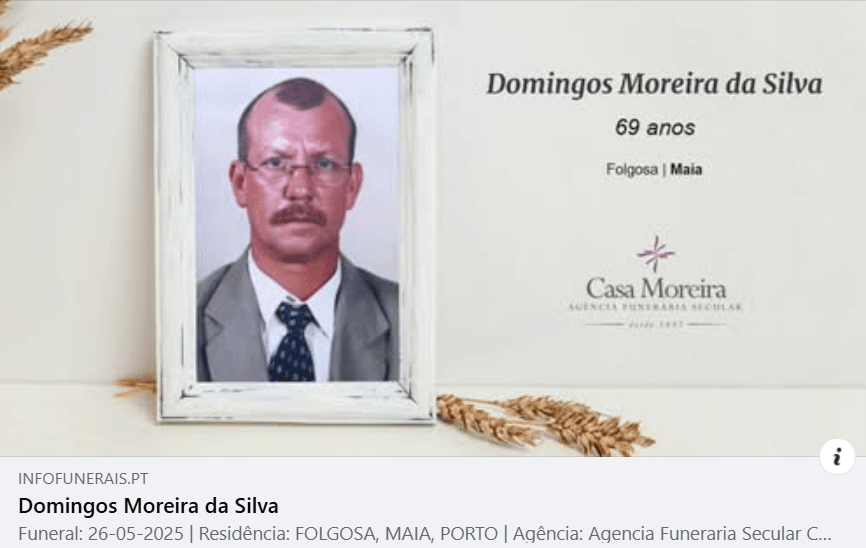 É com profundo pesar que cumprimos o doloroso dever de participar a todos os associados e amigos do Folgosa da Maia Futebol Clube, o falecimento de Domingo Moreira da Silva, Pai do nosso Atleta da formação, Pedro Silva.