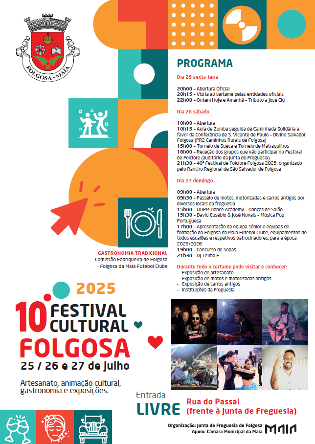 Integrado ainda no 10º Festival Cultural de Folgosa, no domingo, dia 28 julho, pelas 17h00, será realizada a Apresentação Oficial da Equipa Sénior do Folgosa da Maia F.C., e equipamentos e respetivos patrocinadores para todos os escalões da formação de competição do clube para a época 2025/2026.