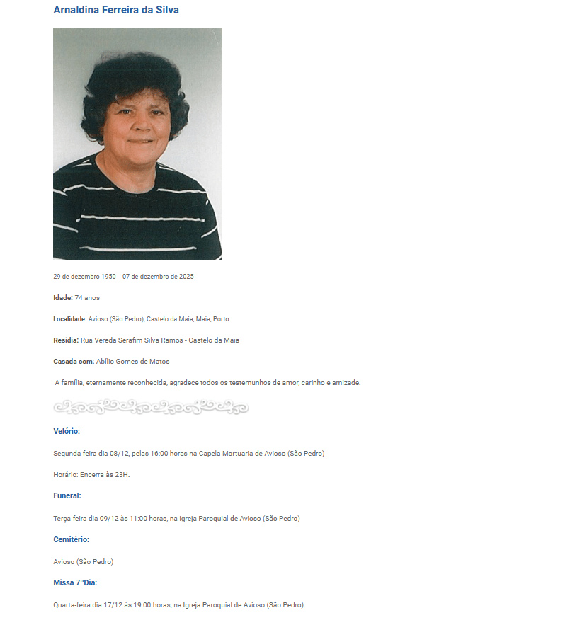 O funeral realiza-se na terça-feira, dia 09, pelas 11h em São Pedro de Avioso.